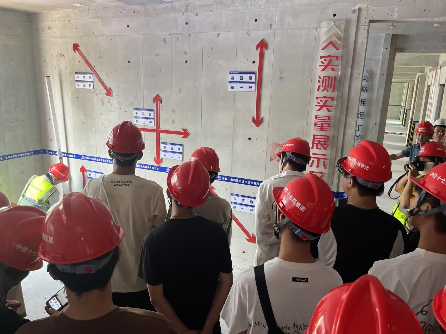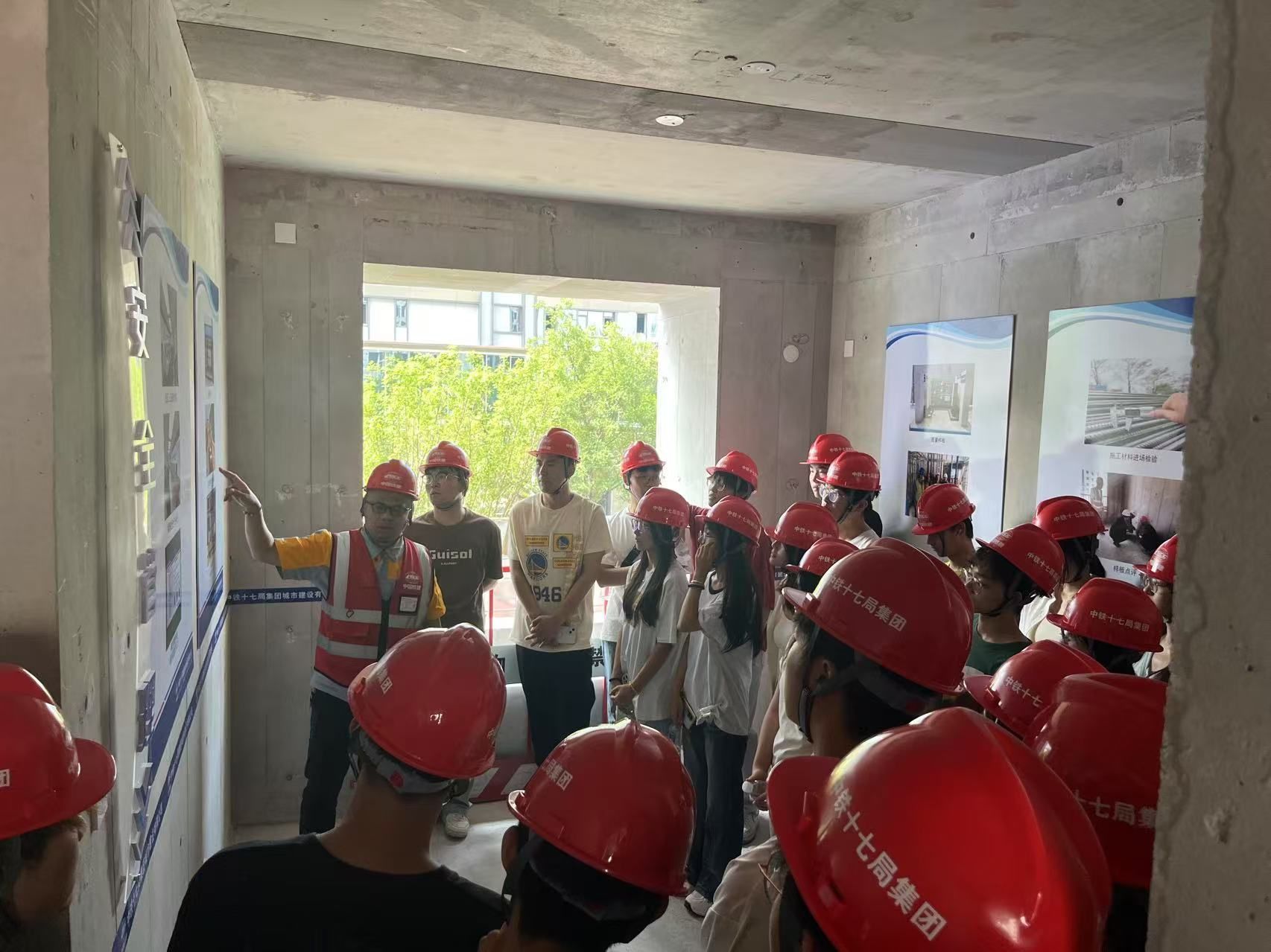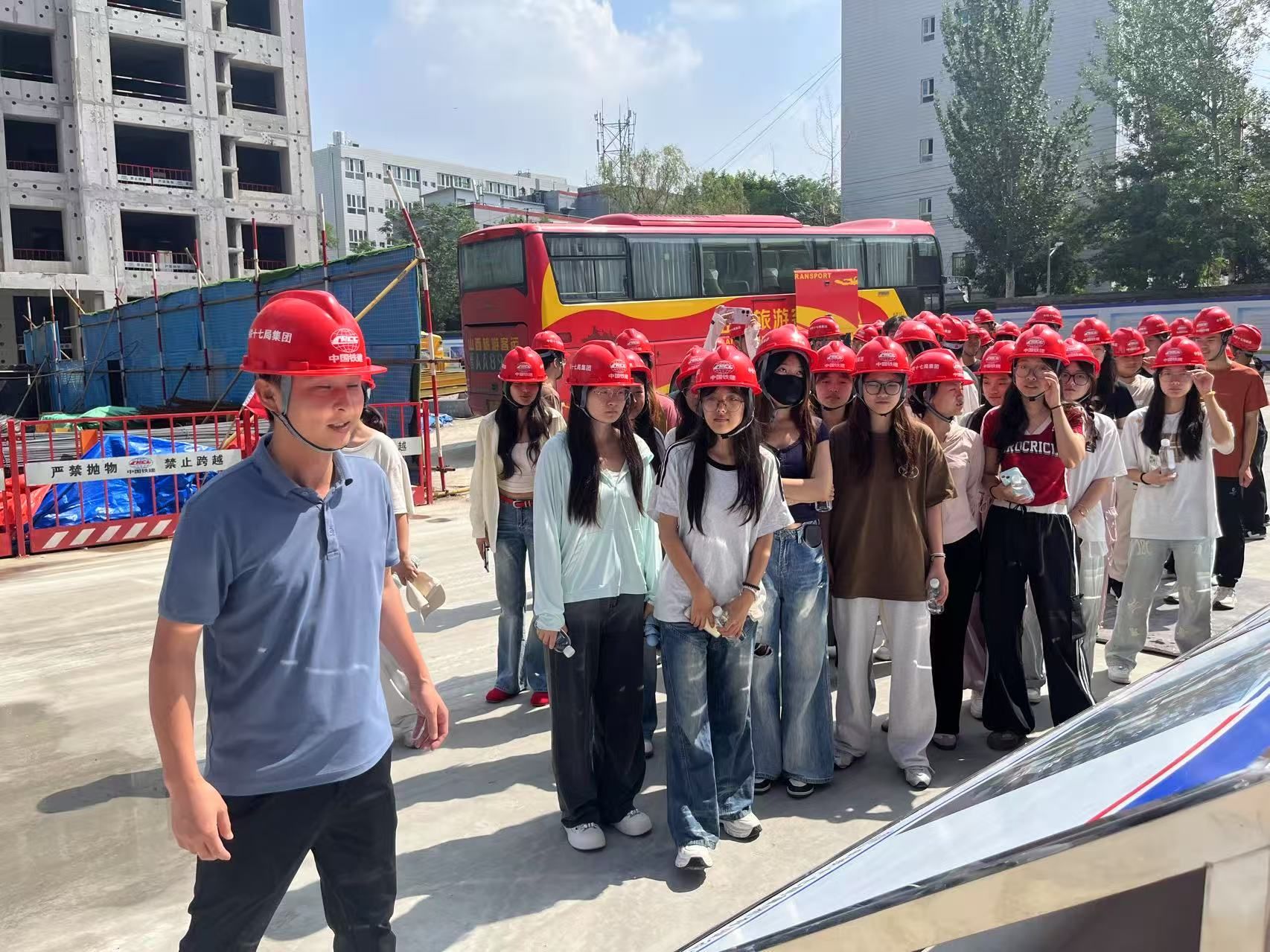 在项目现场,中铁十七局项目负责人详细介绍了工程总体规划、节点进度及技术攻坚成果,并引导师生参观主体结构施工区域。同学们佩戴安全防护装备,深入钢筋混凝土作业现场,直观感受工程建设的标准化流程与精细化管理要求。