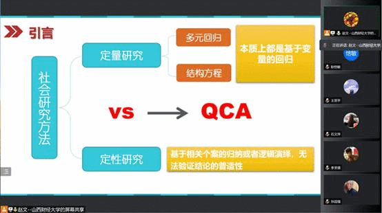抗疫不停研。为提升研究生的科研能力,在疫情期间依旧稳步推进研究工作,4月14日晚18时30分,学院在线上举办了“定性比较分析方法”研讨会。研讨会由孙国强老师主持,赵文老师主讲,90余名老师和同学参加了本次研讨会。