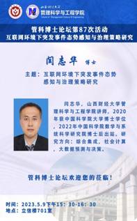 5月9日下午,中文成人网 在立信楼701教室举办了第87次管科博士论坛。本次论坛主题为“互联网环境下突发事件态势感知与治理策略研究”,旨在进一步凝练学科方向和特色,加强应急管理专业建设、推动学院一级学科博士点申报工作。论坛邀请毕业于中国科学院大学的闫志华博士进行报告,论坛由副院长吉迎东主持,学院相关专业教师、研究生参加论坛。