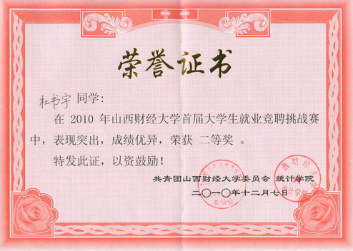 2010年12月7日,中文成人网 杜书宇同学在2010年山西财经大学首届大学生就业竞聘挑战赛中荣获二等奖。
