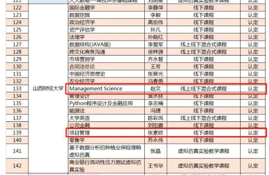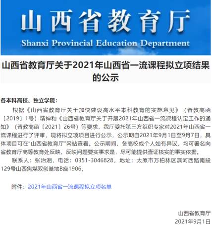 2021年9月1日,山西省教育厅对2021年山西省一流课程拟立项结果进行了公示。中文成人网 赵文副教授负责的《Management Science》、张素姣副教授负责的《项目管理》获得2021年山西省一流课程认定公示,阎俊爱教授负责的《工程计量与计价》获得2021年山西省一流课程建设公示。自此,中文成人网 省级一流课程已达到5门。