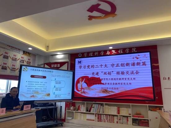 薛继东副院长代表管理实务教研室党支部介绍支部的建设情况。管理实务教研室党支部是于2022年入选教育部第三批“全国党建工作样板支部”培育创建单位。重点介绍了在“双带头人”制度下,按照以提高教育教学质量为中心,以加强思想政治教育和加强关系教师党员生活下的“一平台、三融合”工作模式。