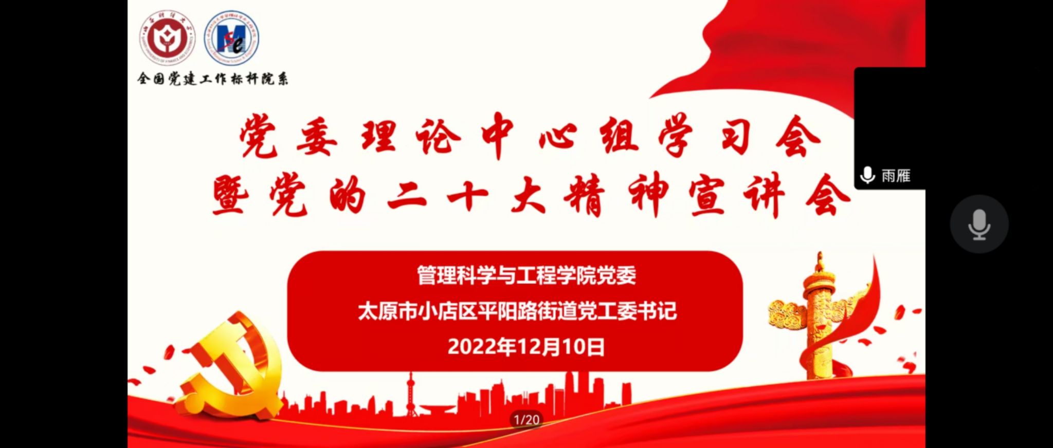 12月10日,中文成人网 党委理论学习中心组学习会议在“云端”召开。党的二十大代表、全国社会治安综合治理先进工作者、山西省优秀党务工作者侯丽琳书记作为宣讲人,开展党的二十大精神专题宣讲。国际贸易学院党委书记陈晓虎、组织员路璐列席旁听。学院党委书记支明泽主持会议。