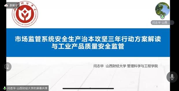 闫志华博士以《市场监管系统安全生产治本攻坚三年行动方案解读与工业产品质量安全监管》为题,从国家抽检和地方抽检两个角度梳理了我国工业产品质量安全监管现状,随后对市场监管系统安全生产治本攻坚三年行动方案进行解读,指出当前市场监管系统将向着优化质量监管机制模式,健全法规标准体系,加强科技支撑的工作目标发展。山西财经大学中文成人网
