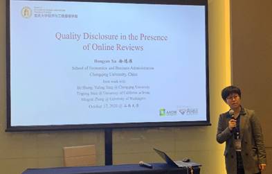 重庆大学的徐鸿雁教授作了题为《Quality Disclosure in the Presence of Online Reviews》的汇报,本文研究了两种方案下的质量纰漏策略,与没有在线评论的情况相比,质量信息可能或多或少可能会被披露,这取决于在线评论的准确性和消费者的搜索成本,结果表明当佣金率较低时,平台方案下的质量披露阈值低于批发方案下的质量披露阈值;当佣金率较高时,平台方案下的质量披露阈值高于批发方案下的质量披露阈值。