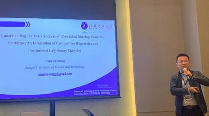 江苏科技大学王念新教授做了关于《Understanding the Early Success of It-enabled Sharing Economy Platforms: An Integration of Competitive Pepertoire and Institutional Legetimacy Theories》的相关汇报,主要对信息技术推动下的共享经济平台的早期成功进行研究,并整合了情报学与法律制度的相关理论。讨论了嵌入式共享经济平台与企业运营初期的三年成功经验有密不可分的联系,以“滴滴”“小猪”和“运满满”三大出行共享APP为例分析得出法律制度的健全对共享经济平台的可持续运营有积极的影响。