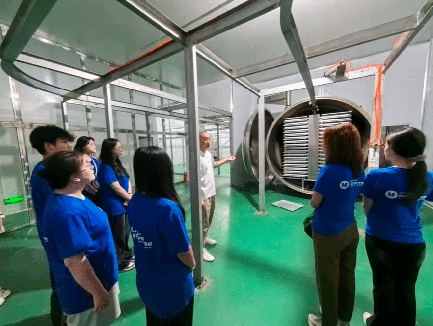 闻喜苹果出阳隅,阳隅苹果在瓮村。在闻喜团县委副书记张瑾,阳隅镇团委书记马经伦的带领下,实践团队来到了翁村冻干果脆加工厂建设现场。跟随厂长的介绍,实践团队参观并了解到冻干机的冻干技术:首先,将新鲜水果和蔬菜切片或切块后,放入冷冻舱进行冷冻,将新鲜果蔬中的水分在低温下冻结成固态,在低温下,水分会迅速结冰。其次,通过真空技术,在低温下加热水,使其中的冰晶不经液态直接升华成气态,从而通过专业导输管除去水分。最后,通过升温,将干燥的水果和蔬菜从冻干室中取出,即可得到具有长期保存能力的冻干食品。休息间隙,实践团队整理了各方面材料进行多角度分析,梳理出使用冻干技术加工果蔬的优点有以下四点:一是可以有效保持新鲜食品原料的色、香、味及营养成分。二是形状不易发生变化,而且具有高效的速溶性和复水性。三是保质期较长,易于食品的保藏。四是为当地创造了大量的就业岗位,吸引了众多外出务工人员返乡就业,促进了当地居民的增收致富。