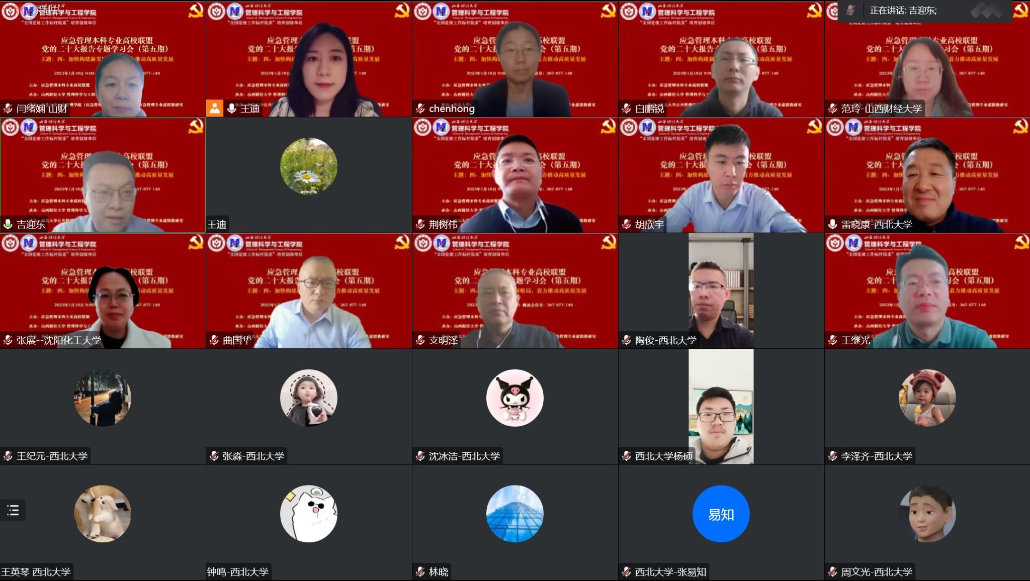 承办,西北大学公共管理学院(应急管理学院)、联盟各高校应急管理专业虚拟教研室协办的党的二十大报告专题学习会(第五期)成功召开。与会人员围绕“加快构建新发展格局,着力推动高质量发展”这一主题认真学习研讨,来自西北大学、中国地质大学、中国矿业大学、沈阳化工大学、武汉理工大学、河南理工大学、山西大学等应急管理本科专业高校联盟各个院校的师生和专家学者参加了学习会。
