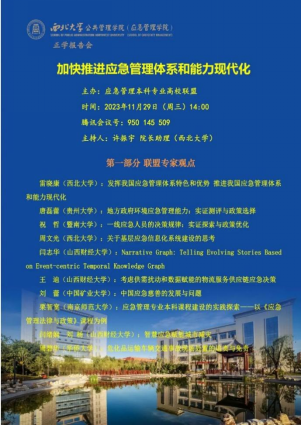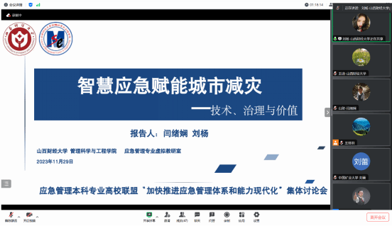 20231129日,由应急管理本科专业高校联盟主办,西北大学公共管理学院(应急管理学院)承办的“加快推进应急管理体系和能力现代化”集体讨论会成功召开,本次会议采用腾讯会议方式,会议报告分为联盟专家组和西北大学研究生组两个部分。山西财经大学中文成人网 院长闫绪娴教授、应急管理教研室主任王迪、应急管理教研室教师闫志华作为联盟专家组成员,受邀进行学术报告。
